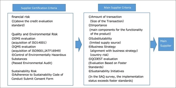 In the supplier selection process, efforts toward ESG (Environmental, Social, and Governance) are important evaluation criteria, in addition to financial status. For new and existing suppliers, the conclusion of a Basic Purchasing Agreement, which includes agreement to the "Sustainability Code of Conduct," is a mandatory certification requirement, along with the confirmation of financial evaluation, environmental management, and quality control systems.