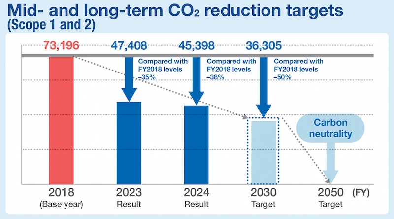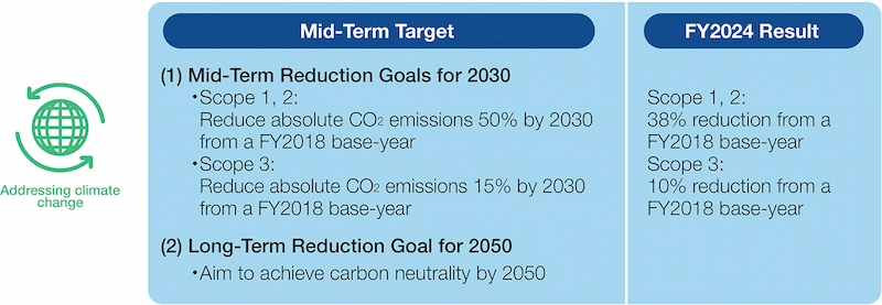 We revised our CO2 emissions reduction targets in 2021. The revised mid-term goals are to reduce absolute Scope 1 and 2 emissions 50% by 2030 from a FY2018 base year and to reduce absolute Scope 3 emissions 15% by 2030 from a FY2018 base year. We also set a new long-term goal of achieving carbon neutrality by 2050. We are actively promoting initiatives to achieve the reduction.