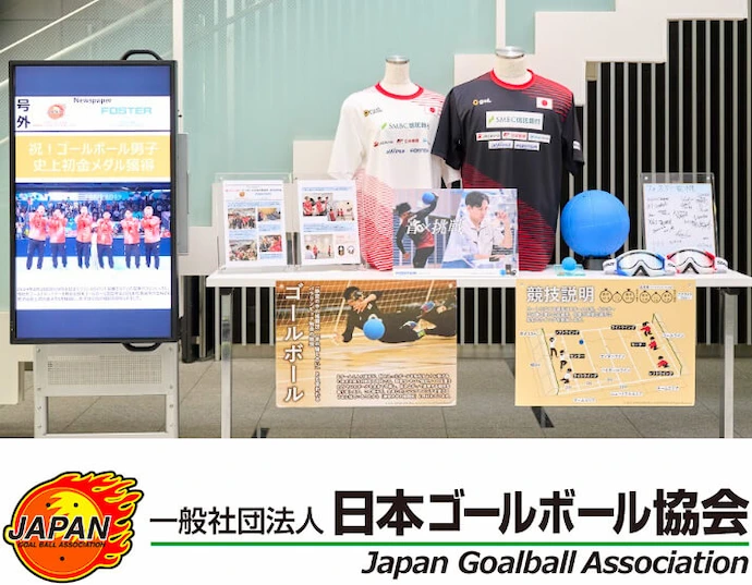 At the lobby of our headquarters, we exhibit a signage, uniforms, game rules, and other items to promote goalball. We also hold sessions for experiencing goalball at internal events to engage employees with the sport.
