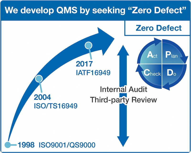 Having started with the acquisition of the ISO 9001 and QS9000 certifications in 1998, we have been steadily expanding certifications on international quality management systems, having obtained certifications under ISO/TS 16949 in 2004 and IATF 16949 in 2017. At the same time, we identify issues through internal and regular third-party audits and implement a PDCA cycle, thus improving the effectiveness of our QMS.