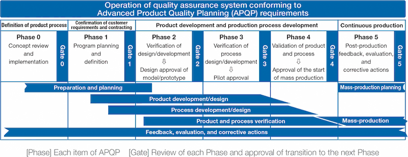 For quality assurance throughout processes from product planning to shipment, we have built a quality assurance activity system based on Advanced Product Quality Planning (APQP) and operate this system globally. We ensure that we take the quality actions needed in each Phase. At each one of the five Gates, we review the activities in each Phase, and approve the transition to the next Phase. Through this process, we ensure comprehensive and uninterrupted quality assurance.